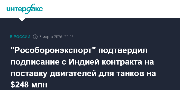 "Рособоронэкспорт" подтвердил подписание с Индией контракта на поставку двигателей для танков на $248 млн