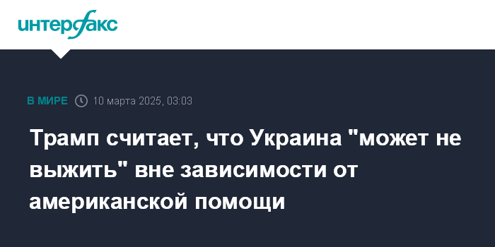 Москва. 10 марта. INTERFAX.RU - Президент США Дональд Трамп высказал мнение, что выживание Украины не зависит от того, получает она помощь со стороны Вашингтона или нет.