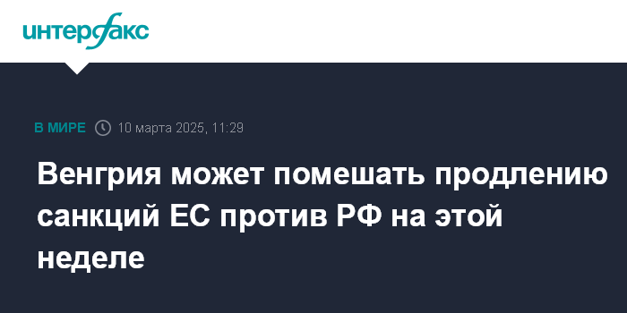 Москва. 10 марта. INTERFAX.RU - В ЕС встревожены возможностью попытки Венгрии сорвать очередное продление санкций против РФ, для которого нужно к 15 марта заручиться единогласной поддержкой всех стран союза, сообщает в понедельник издание Euractiv со ссылкой на источники.