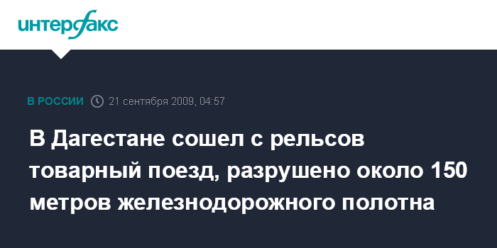 Махачкала. 21 сентября. ИНТЕРФАКС-ЮГ - У населенного пункта Кизилюрт (Дагестан) в направлении на Махачкалу сошел с рельсов товарный поезд, состоящий из восьми вагонов, жертв нет.