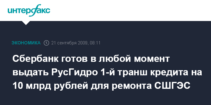 Сбербанк готов в любой момент выдать РусГидро 1-й транш кредита на 10 млрд рублей для ремонта СШГЭС