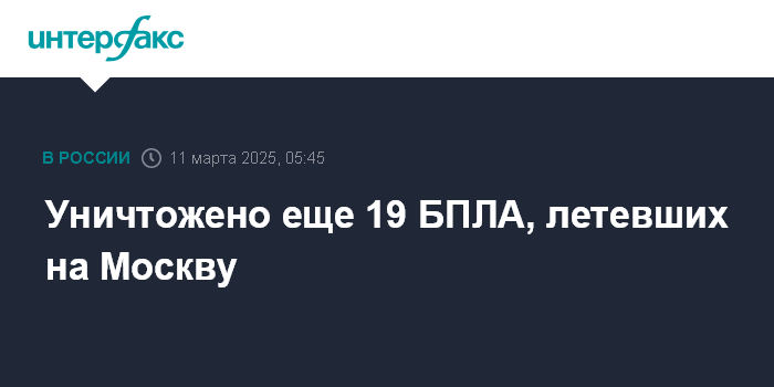 Москва. 11 марта. INTERFAX.RU - Система противовоздушной обороны уничтожила еще 19 беспилотников, летевших в сторону Москвы, сообщил мэр города Сергей Собянин.