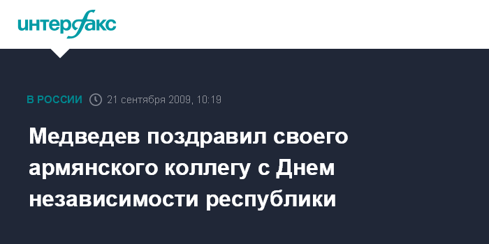 Москва. 21 сентября. INTERFAX.RU - Президент России Дмитрий Медведев направил поздравление президенту Республики Армения Сержу Саргсяну в связи с национальным праздником Республики Армения - Днем независимости, сообщили в пресс-службе главы государства. "С удовлетворением отмечаю поступательное развитие тесных, дружественных отношений между Россией и Арменией, характеризующихся взаимопониманием, уважением и доверием. Убежден, углубление российско-армянского стратегического партнерства способствует социально-экономическому прогрессу наших стран, служит делу мира и стабильности в Закавказье", - говорится, в частности, в тексте поздравления.