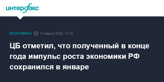 Москва. 11 марта. INTERFAX.RU - Импульс роста экономики РФ, который она получила в конце 2024 года, сохранился в январе, в дальнейшем ожидается плавное ее замедление, говорится в бюллетене "О чем говорят тренды", подготовленном департаментом исследований и прогнозирования ЦБ.