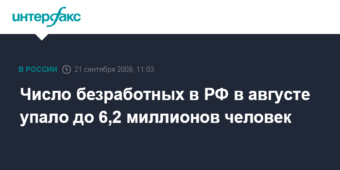 Москва. 20 августа. INTERFAX.RU - Общая численность безработных в России в августе 2009 года снизилось к июлю на 1,6% и составила 6,2 млн человек на конец месяца, сообщила Федеральная служба государственной статистики (Росстат). Таким образом, уровень безработицы в России в августе снизился до 8,1%.