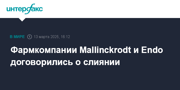 Москва. 13 марта. INTERFAX.RU - Фармацевтические компании Mallinckrodt Plc и Endo Inc. договорились о слиянии, говорится в их совместном пресс-релизе.