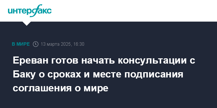 Москва. 13 марта. INTERFAX.RU - Соглашение о мире с Азербайджаном готово к подписанию, Ереван готов начать с Баку консультации вокруг сроков и места подписания документа, заявили в МИД Армении.