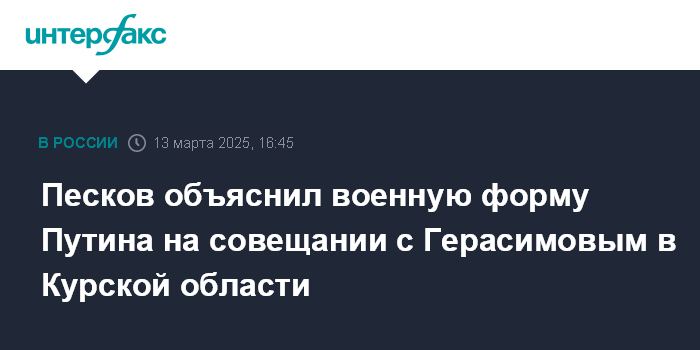 Москва. 13 марта. INTERFAX.RU - Президент РФ Владимир Путин появился в пункте управления курской группировкой в военной форме, чтобы подтвердить решимость как можно скорее завершить освобождение региона, заявил его пресс-секретарь Дмитрий Песков.