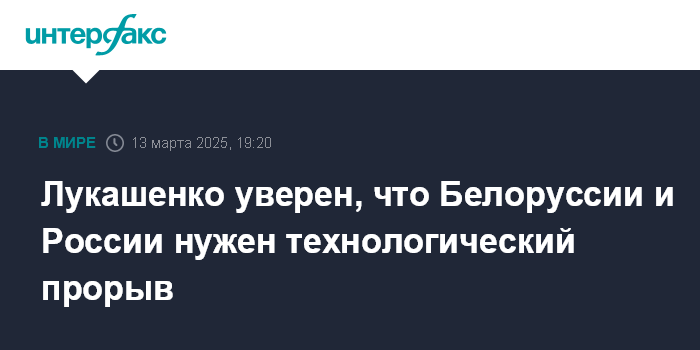 Москва. 13 марта. INTERFAX.RU - Белоруссии и России необходим технологический прорыв, заявил президент Белоруссии Александр Лукашенко.