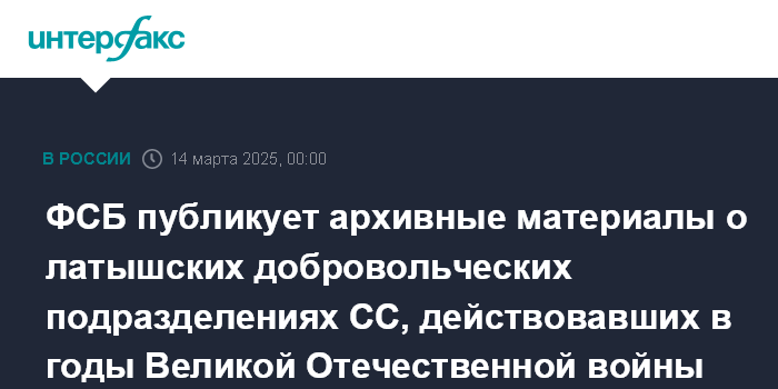 Москва. 14 марта. INTERFAX.RU - Центр общественных связей (ЦОС) ФСБ публикует архивные материалы о латышских добровольческих отрядах СС, действовавших в годы Великой Отечественной войны.