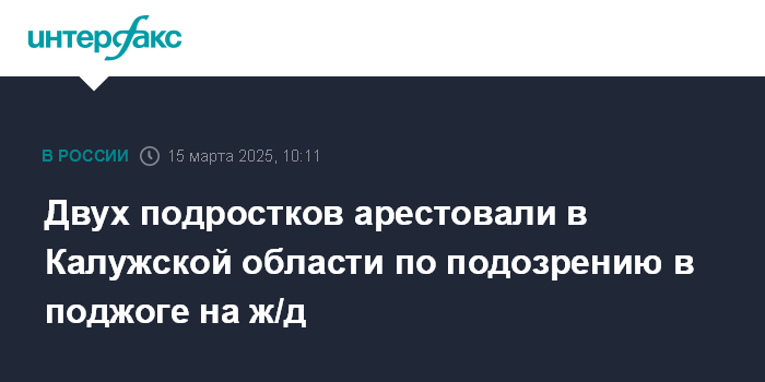 Москва. 15 марта. INTERFAX.RU - Двое несовершеннолетних подозреваются в поджоге железнодорожной транспортной инфраструктуры в Калужской области за вознаграждение. Они заключены под стражу.