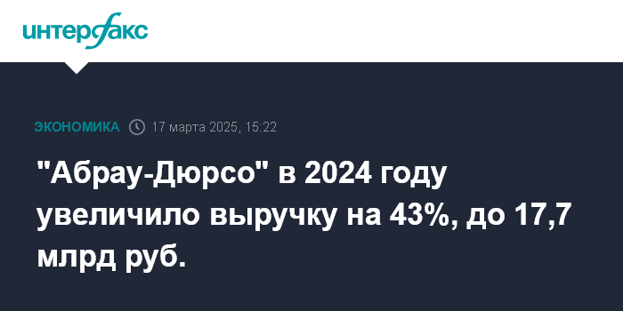 Москва. 17 марта. INTERFAX.RU - Выручка компании "Абрау-Дюрсо", ведущего производителя игристых вин в РФ, в 2024 году составила 17,749 млрд рублей, что на 43% больше, чем в 2023 году, сообщается в презентации компании.