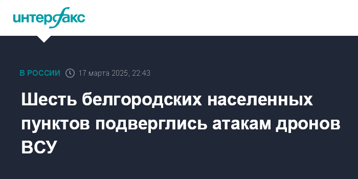 Москва. 17 марта. INTERFAX.RU - Губернатор Белгородской области Вячеслав Гладков сообщил о шести населенных пунктах, атакованных беспилотниками ВСУ, предварительно, пострадавших нет.