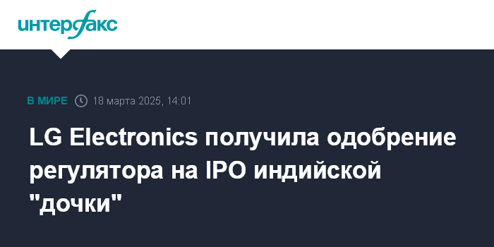 Москва. 18 марта. INTERFAX.RU - Комитет по ценным бумагам и биржам Индии (Securities and Exchange Board of India, SEBI) одобрил заявку на первичное размещение акций местного подразделения южнокорейской LG Electronics Inc.