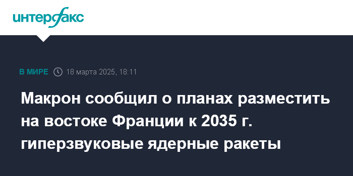 Москва. 18 марта. INTERFAX.RU - Президент Франции Эммануэль Макрон, посетивший во вторник базу ВВС в Люксёй-ле-Бен в департаменте Верхняя Сона на востоке страны, объявил о размещении на ней к 2035 году самолетов Rafale с гиперзвуковыми ядерными ракетами.