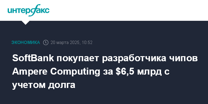 Москва. 20 марта. INTERFAX.RU - Японская SoftBank Group Corp. покупает американского разработчика чипов Ampere Computing за 973 млрд иен ($6,5 млрд).