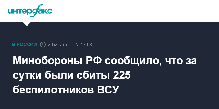 Москва. 20 марта. INTERFAX.RU - Российские военные в течение суток сбили 225 дронов вооруженных сил Украины (ВСУ), заявили в Минобороны РФ в четверг.