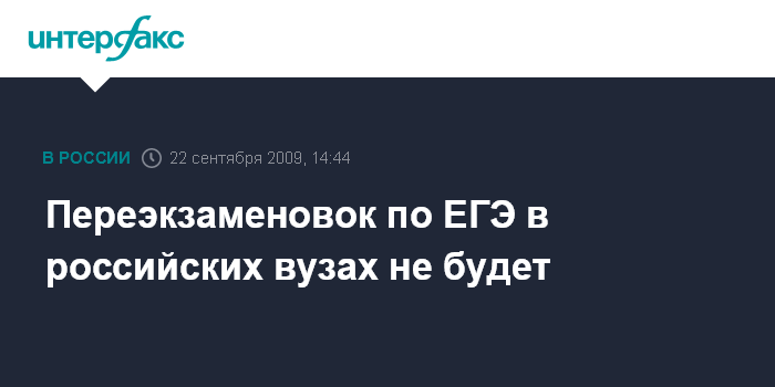 Москва. 22 сентября. INTERFAX.RU - Переэкзаменовки для студентов, поступивших в вузы по результатам Единого государственного экзамена (ЕГЭ), не будет, сообщил руководитель Федерального агентства по образованию (Рособразование) Николай Булаев.