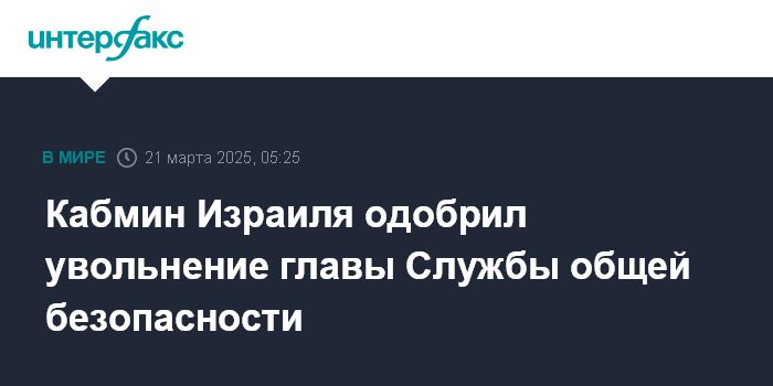 Москва. 21 марта. INTERFAX.RU - Кабинет министров Израиля единогласно проголосовал за снятие Ронена Бара с должности главы Службы общей безопасности Израиля ("Шин-Бет"), сообщила The Times of Israel со ссылкой на канцелярию израильского премьер-министра Биньямина Нетаньяху.