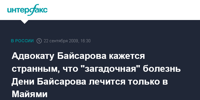 Москва. 22 сентября. ИНТЕРФАКС - Адвокату Руслана Байсарова Александру Добровинскому кажется странным, что "загадочная" болезнь Дени Байсарова, права на которого оспаривают его подзащитный и певица Кристина Орбакайте, лечится только в Майями.