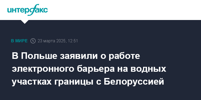 Москва. 23 марта. INTERFAX.RU - Электронное заграждение на водных участках польско-белорусской границы начало работу, сообщила в воскресенье пресс-служба министерства внутренних дел и администрации Польши.