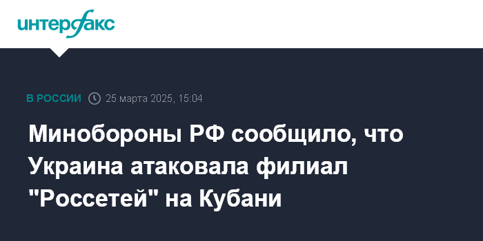 Минобороны РФ сообщило, что Украина атаковала филиал "Россетей" на Кубани