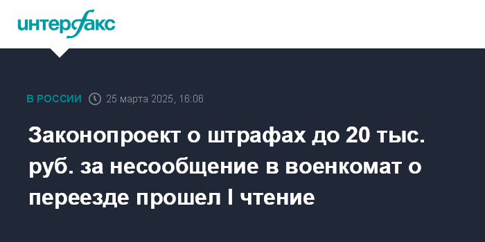 Законопроект о штрафах до 20 тыс. руб. за несообщение в военкомат о переезде прошел I чтение