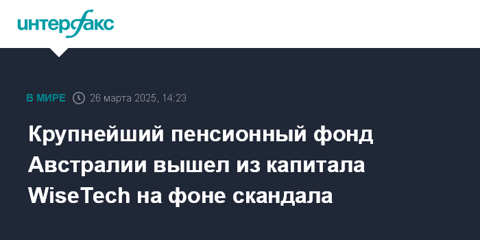 Москва. 26 марта. INTERFAX.RU - AustralianSuper, крупнейший пенсионный фонд Австралии, избавился от инвестиций в ИТ-компанию WiseTech Global Ltd на фоне скандала в руководстве фирмы.