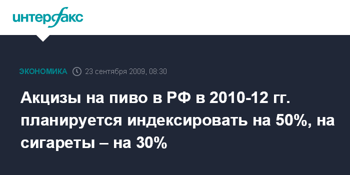Акцизы на пиво в РФ в 2010-12 гг. планируется индексировать на 50%, на сигареты – на 30%