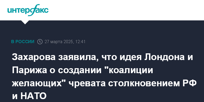 "Россия категорически против такого сценария, который чреват прямым столкновением России и НАТО", - сказала она на брифинге в четверг, комментируя инициативу Лондона и Парижа о создании "коалиции желающих" для гарантий мира на Украине.