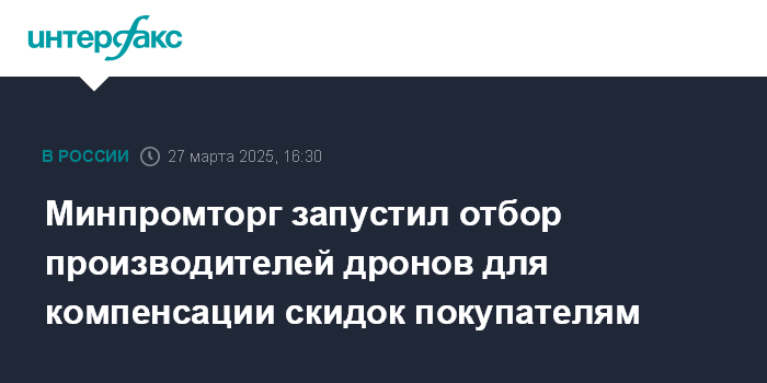 Москва. 27 марта. INTERFAX.RU - Минпромторг объявляет отбор на право получения изготовителями беспилотных авиационных систем (БАС) субсидии для возмещения недополученных ими доходов при предоставлении скидки покупателям.