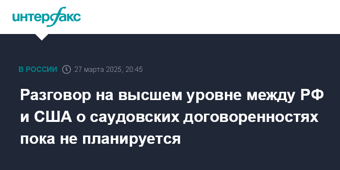Москва. 27 марта. INTERFAX.RU - Контакты на высшем уровне между Россией и Соединенными Штатами касательно договоренностей, достигнутых на консультациях экспертных групп в Эр-Рияде, пока не планируются, сообщил пресс-секретарь президента РФ Дмитрий Песков.