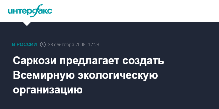 Москва. 23 сентября. INTERFAX.RU - Президент Франции Николя Саркози высказался за создание к 2012 г. Всемирной экологической организации. Президент Франции, выступивший на саммите по изменению климата в штаб-квартире ООН в Нью-Йорке, считает, что новая организация могла бы заниматься развитием международного экологического права и обеспечивать контроль за выполнением обязательств, которые будут приняты в декабре в Копенгагене.