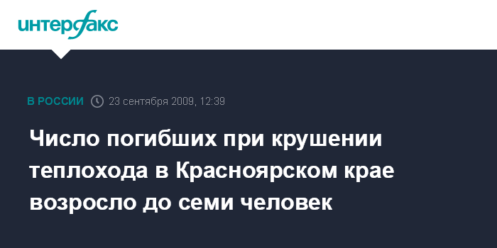 Москва. 23 сентября. INTERFAX.RU - Количество погибших при крушении теплохода, затонувшего на озере Пясино в 80 км от Норильска, возросло до семи человек. Как сообщила пресс-служба ГУВД по Красноярскому краю, погибли не только четыре члена экипажа, которые оказались заблокированными в кубрике в результате опрокидывания судна, но и те три человека, которые в течение некоторого времени удерживались на перевернутом судне.