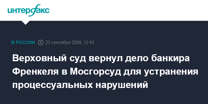 Москва. 23 сентября. INTERFAX.RU - Верховный суд РФ снял с рассмотрения дело банкира Алексея Френкеля, осужденного на 19 лет заключения за организацию убийства первого зампредседателя ЦБ РФ Андрея Козлова. Как передает корреспондент "Интерфакса", дело возвращено в Мосгорсуд для устранения процессуальных нарушений.