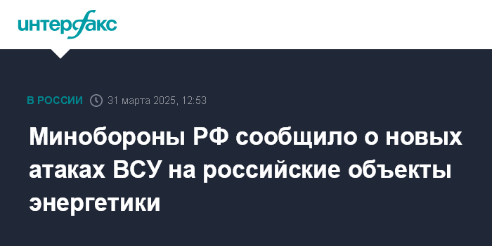 Москва. 31 марта. INTERFAX.RU - Российские военные сообщили, что Украина вновь нанесла удары по энергетическим объектам РФ, в воскресенье была атакована инфраструктура в Брянской области.