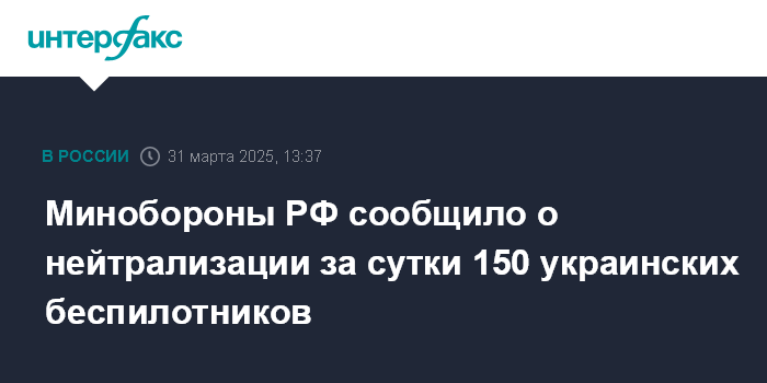 Москва. 31 марта. INTERFAX.RU - Российские военные за сутки сбили 150 украинских дронов, сообщили в Минобороны РФ.