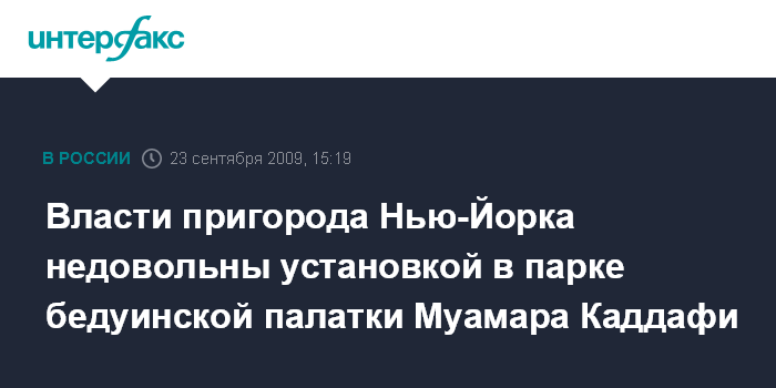 Вашингтон. 23 сентября. INTERFAX.RU - Власти Бэдфорда, пригорода Нью- Йорка, выразили недовольство тем, что в городском парке была установлена бедуинская палатка ливийского лидера Муамара Каддафи, прибывшего в США для участия в 64-й сессии Генассамблеи ООН, сообщает CNN.