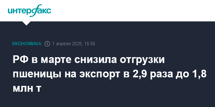 Москва. 1 апреля. INTERFAX.RU - РФ в марте отгрузила на экспорт 1,784 млн тонн пшеницы, что в 2,9 раза меньше, чем в марте прошлого года (5,126 млн тонн), говорится в мониторинге Российского зернового союза.