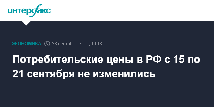 Москва. 23 сентября. INTERFAX.RU - Потребительские цены в РФ с 15 по 21 сентября не изменились, сообщил Росстат в среду. С начала сентября инфляция составила также 0%, с начала года - 8,1% (в 2008 году с начала сентября - 0,5%, в целом за сентябрь - 0,8%, с начала года - 10,2%).