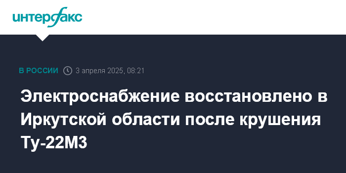 Москва. 3 апреля. INTERFAX.RU - Подача электричества, нарушенная из-за крушения самолета Ту-22М3, возобновлена в деревне Буреть Иркутской области, сообщил губернатор региона Игорь Кобзев в своем телеграм-канале в четверг.