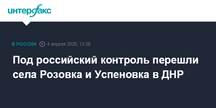 Москва. 4 апреля. INTERFAX.RU - Российские военные взяли под контроль населенные пункты Розовка и Успеновка в Донецкой народной республике (ДНР), заявили в Минобороны РФ в пятницу.