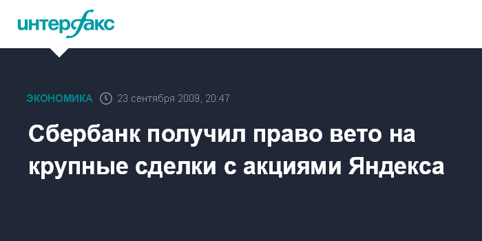 Сбербанк получил право вето на крупные сделки с акциями Яндекса