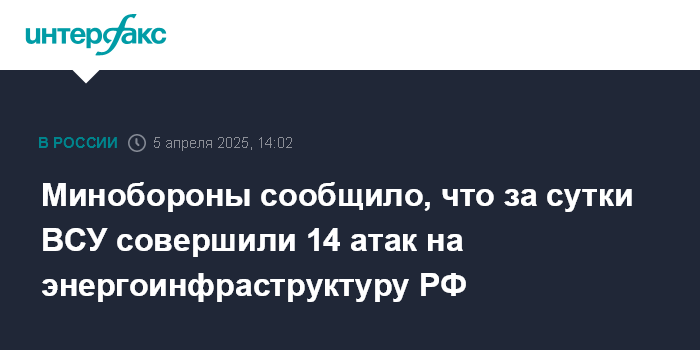 Москва. 5 апреля. INTERFAX.RU - За прошедшие сутки вооруженные силы Украины (ВСУ) совершили четырнадцать атак на энергетическую инфраструктуру РФ в Брянской, Белгородской, Смоленской, Липецкой, Херсонской, Воронежской областях и ЛНР, заявили в Минобороны РФ в субботу.