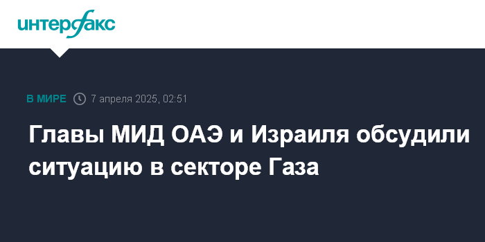 Москва. 7 апреля. INTERFAX.RU - Министр иностранных дел Объединенных Арабских Эмиратов шейх Абдалла бен Заид Аль Нахайян обсудил в Абу-Даби со своим израильским коллегой Гидеоном Сааром ситуацию в секторе Газа, сообщает государственное информагентство ОАЭ.