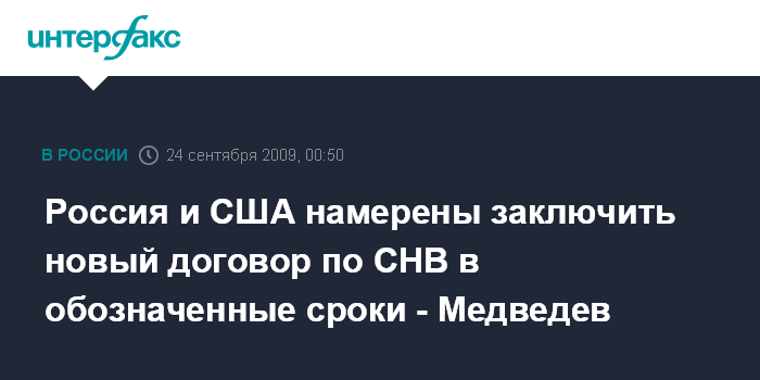 Нью-Йорк. 24 сентября. ИНТЕРФАКС - Россия и Америка намерены заключить новый Договор по СНВ в обозначенные ранее сроки, заявил президент России Дмитрий Медведев по итогам встречи с президентом США Бараком Обамой.