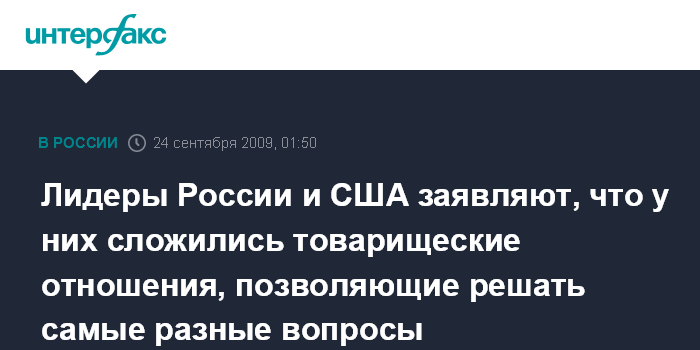 Нью-Йорк. 24 сентября. ИНТЕРФАКС - Лидеры России и США отмечают, что у них сложились конструктивные взаимоотношения, позволяющие обсуждать и решать насущные проблемы двух стран.