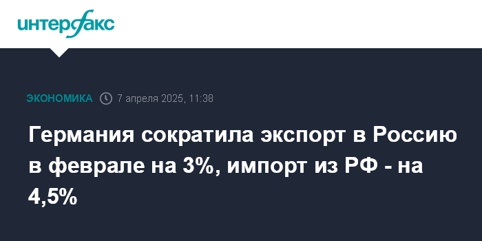 Москва. 7 апреля. INTERFAX.RU - Германия сократила экспорт в Россию в феврале на 3% по сравнению с январем - до 592,84 млн евро, говорится в отчете Федерального статистического управления ФРГ (Destatis).