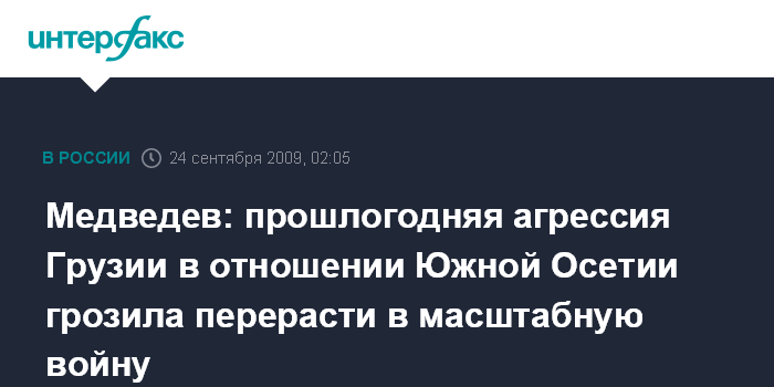 Нью-Йорк. 24 сентября. ИНТЕРФАКС - Агрессия Грузии против Южной Осетии в августе прошлого года могла перерасти в масштабную войну, заявил президент РФ Дмитрий Медведев.