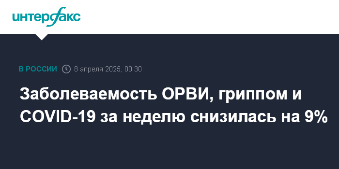 Москва. 8 апреля. INTERFAX.RU - Число заболевших гриппом и ОРВИ в России по сравнению с прошлой неделей снизилось на 8,9%, заболеваемость COVID-19 за аналогичный период также снизилась на 9%, сообщили в Роспотребнадзоре.